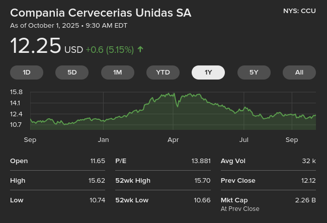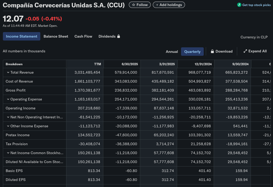 Well that's neat. CCU had a temporary dip but somehow beat inflation. Yes even in Chile, I checked. It is fair to point out that a ticker symbol price is one metric in the terms of overall financial health. If you go look at their quarterly financials for Q2 this year, it is no bueno.
